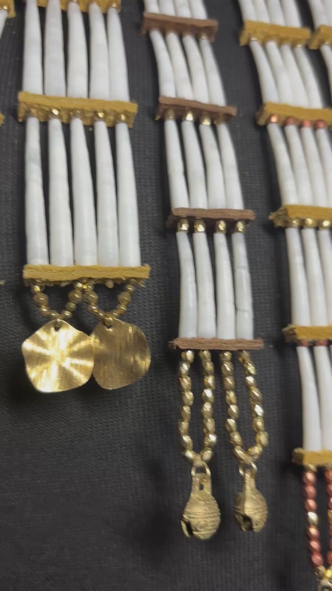 12” long, 1” wide, 18k gold hooks, gold detailing beads, antique brass bells, tan deerhide.