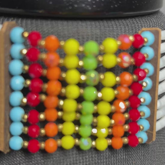 The sky blues reflect the openness above, where prayers travel. Gold beads shimmer softly like sunlight dancing through rising smoke. With each step, the bells echo a faint, tender sound — as if the piece itself remembers ceremony, or as though an ancestor is speaking softly back. This piece carries the prayer of connection — a quiet invitation to step closer to the fire, to be held by its warmth, and to let your prayers rise where fire meets sky.